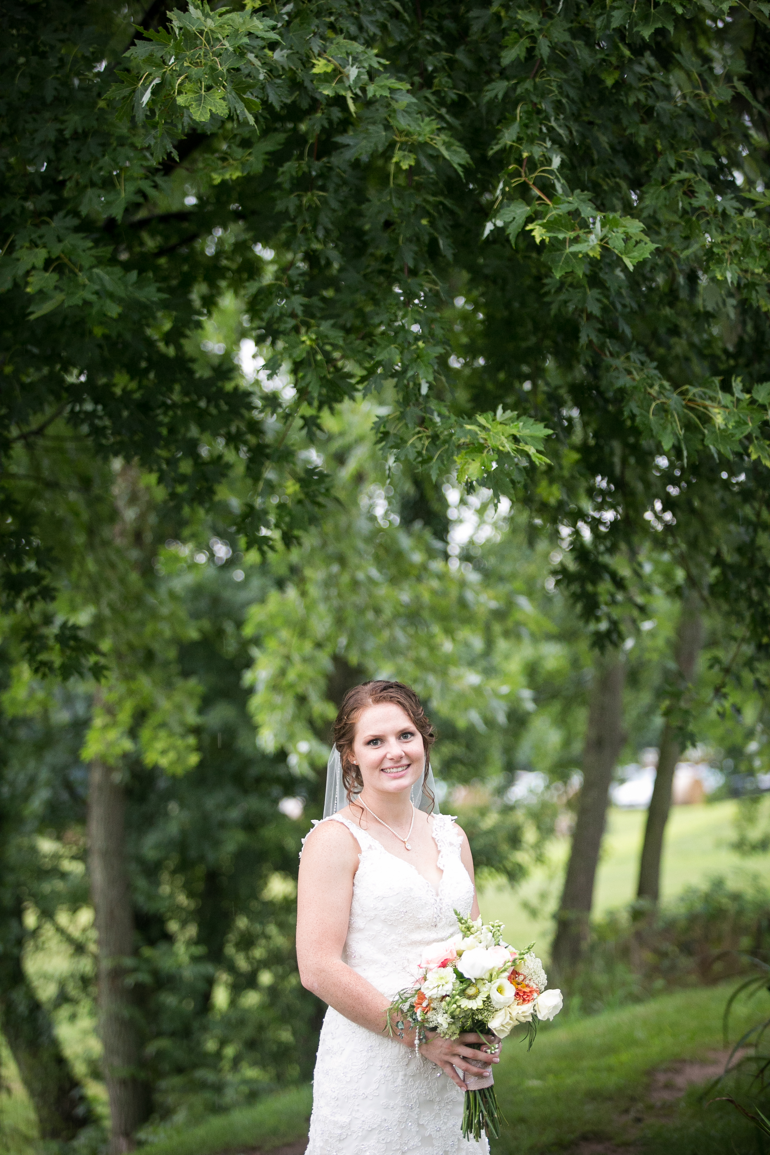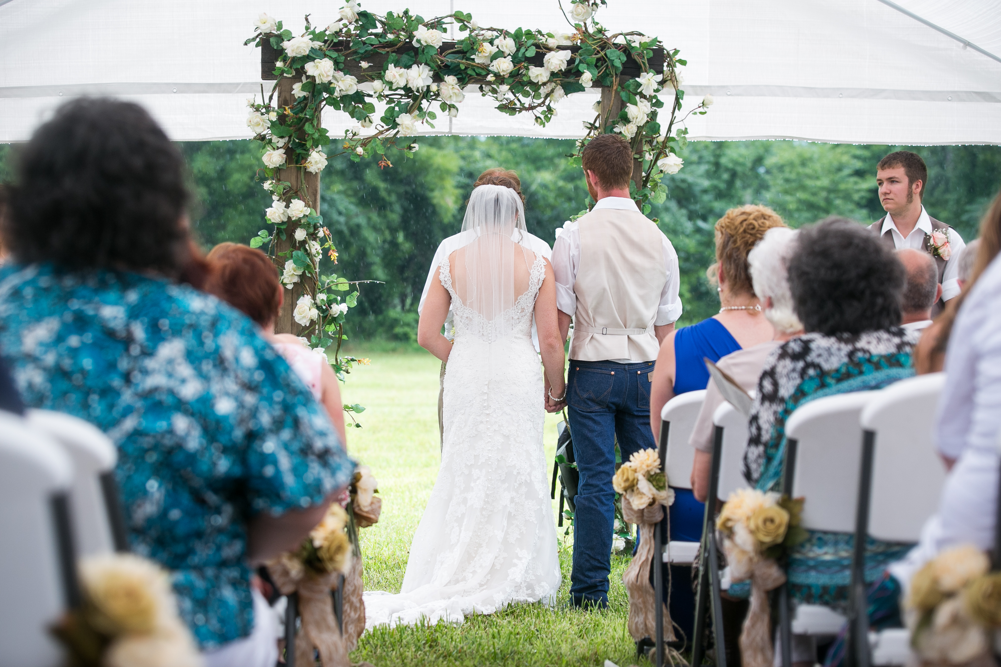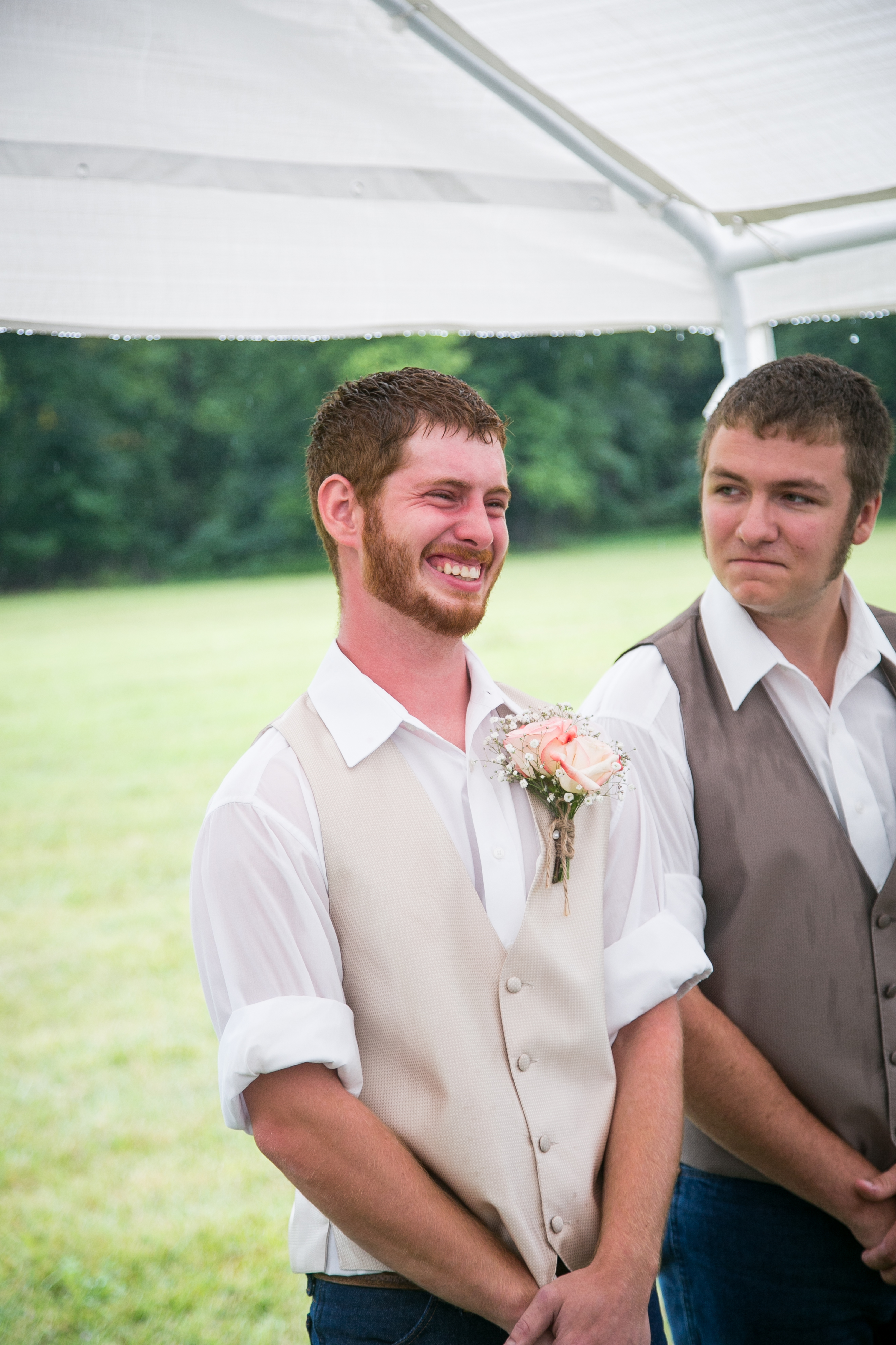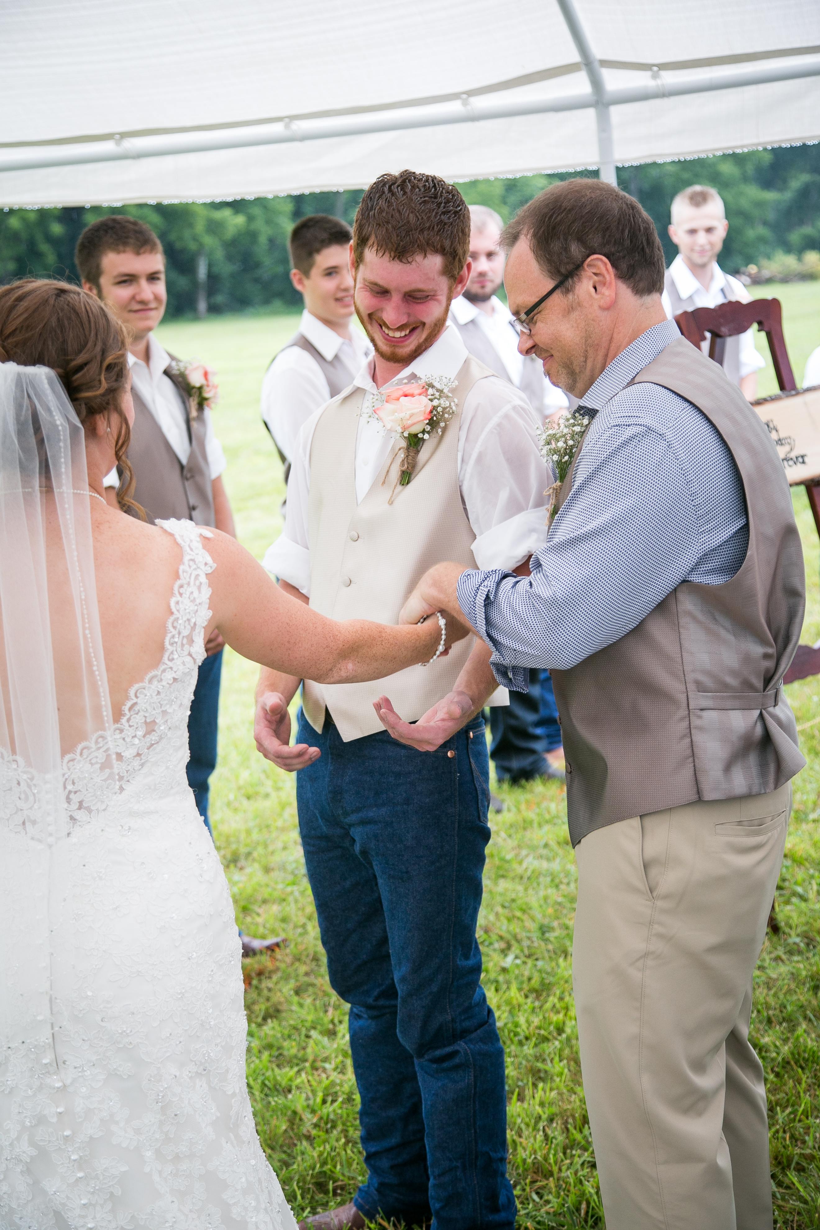 The morning started with the girls in a beautiful bridal house. Emiline looked stunning in her dress and we took full advantage of all the window light in the house. It rained off and on so when we had a break in the rain we were able to take advantage of the beautiful property and get some photos outside. The ceremony was planed to be in the pasture and about a half hour before things were to get started a heavy rain rolled in.  Even with the rain Chris and Emiline were not going to let that change their plans. They decided to move a large white tent over top of the ceremony site and kept everything to plan. After the ceremony there was a brief break in the rain so we explored the property a bit.