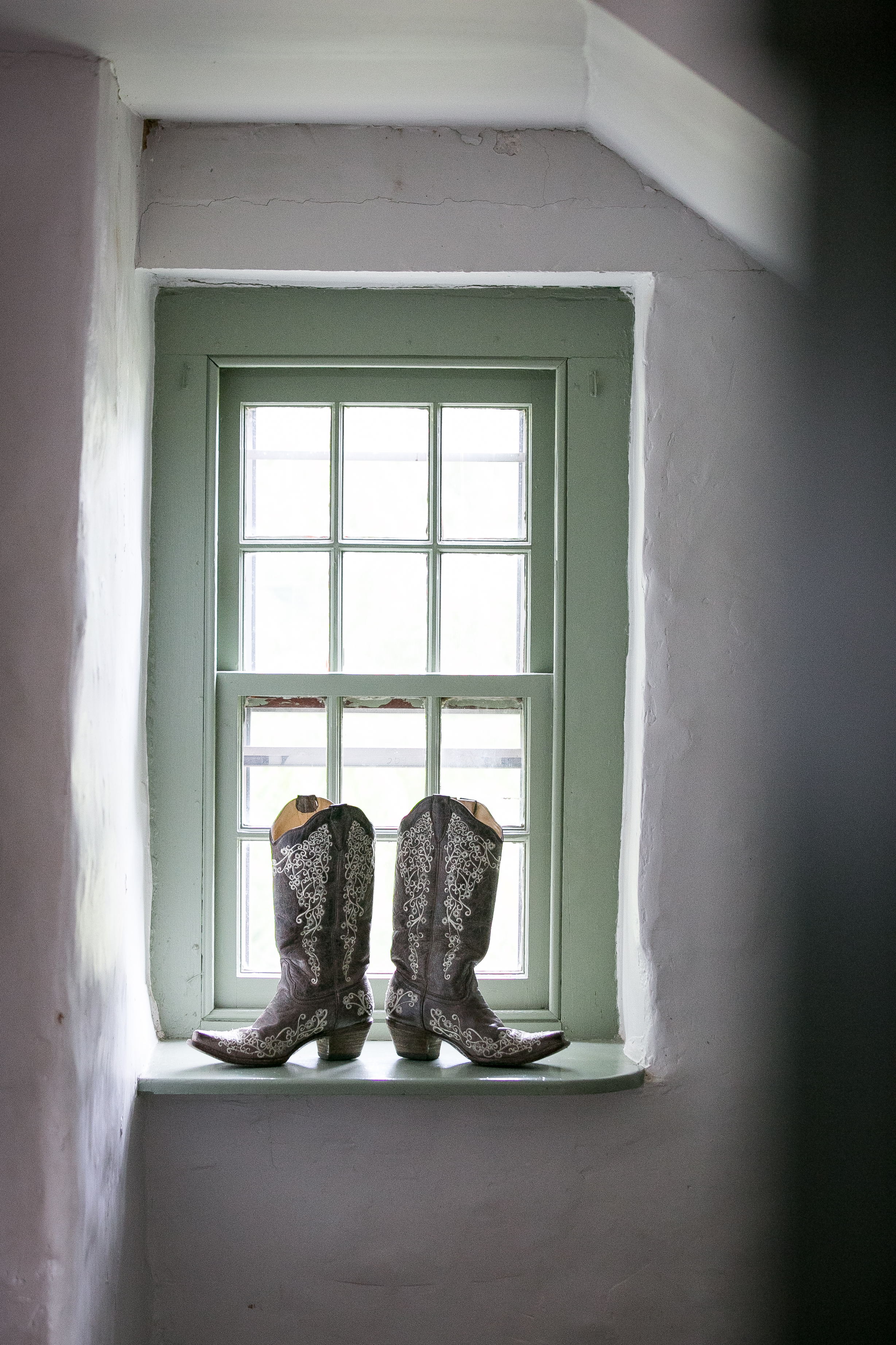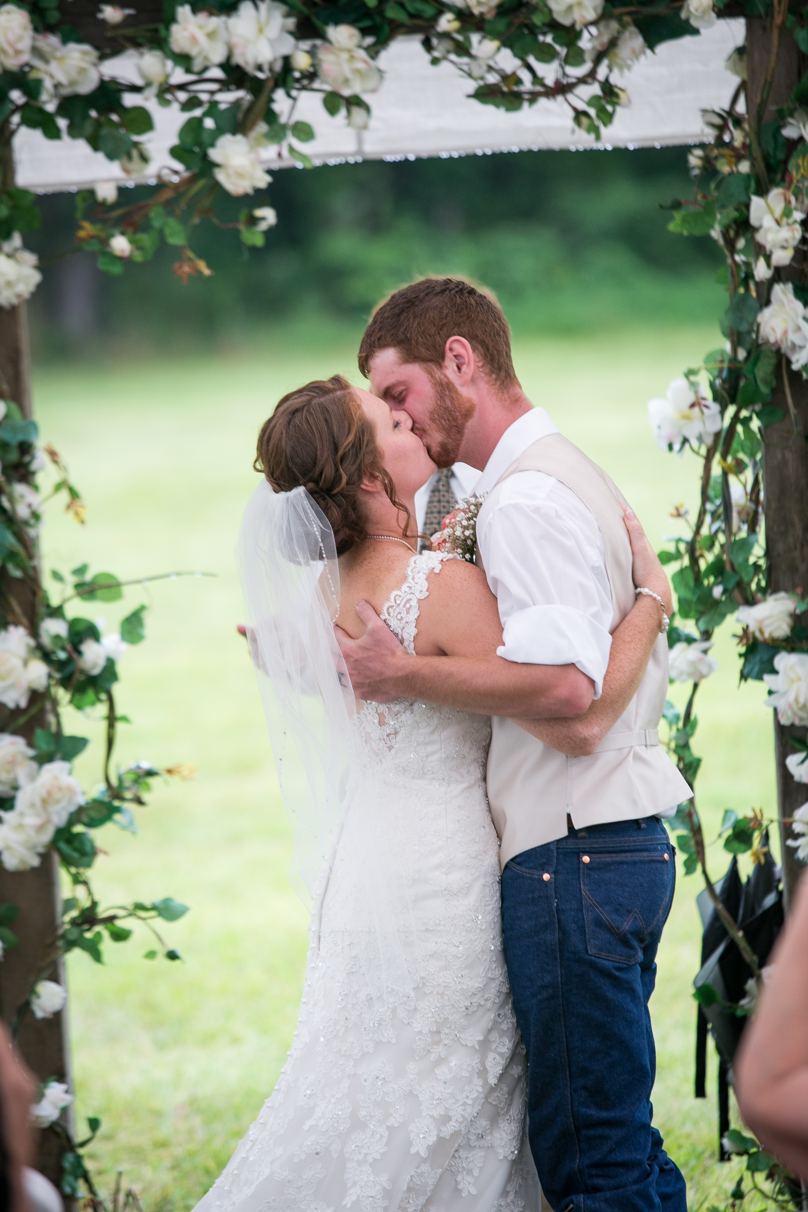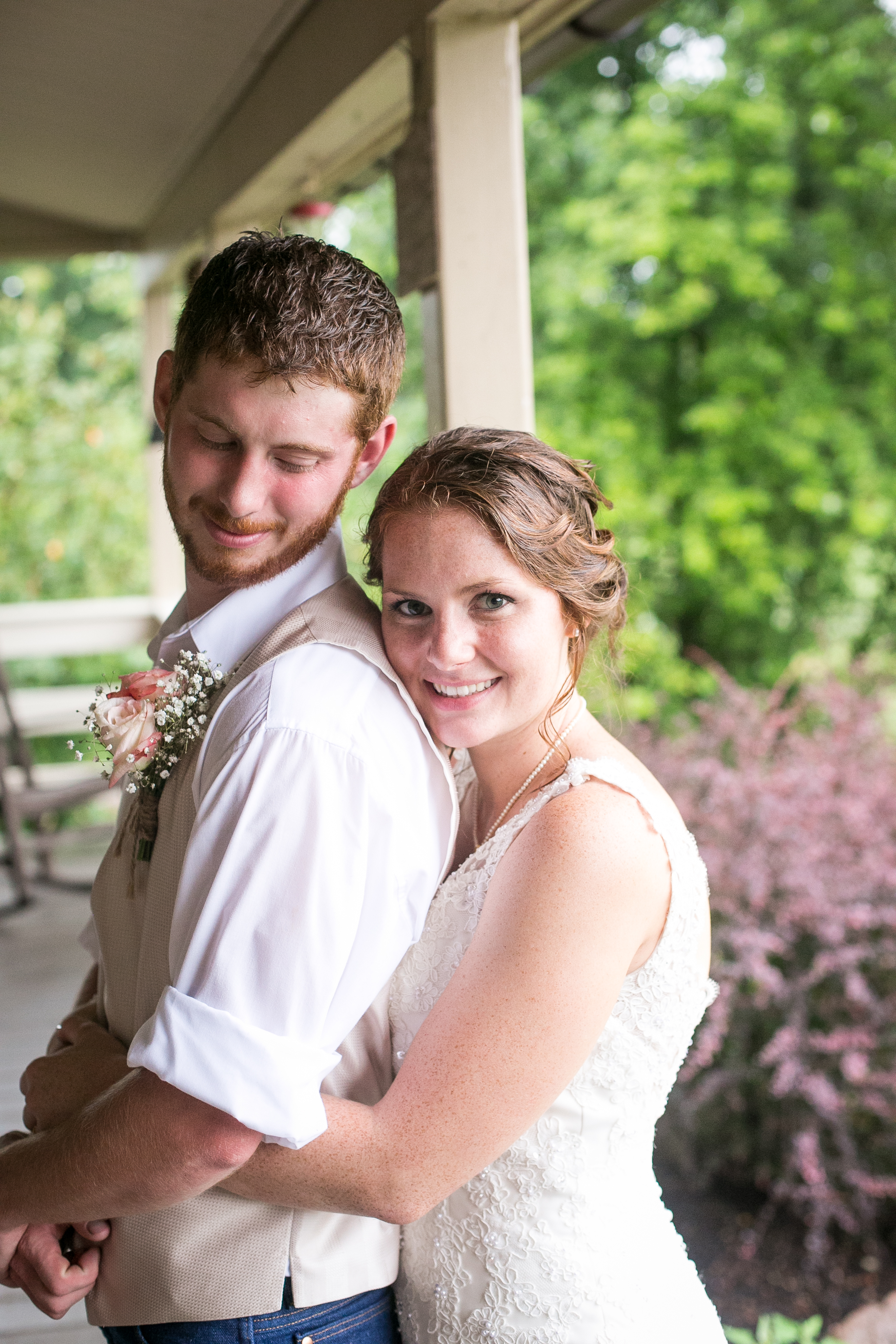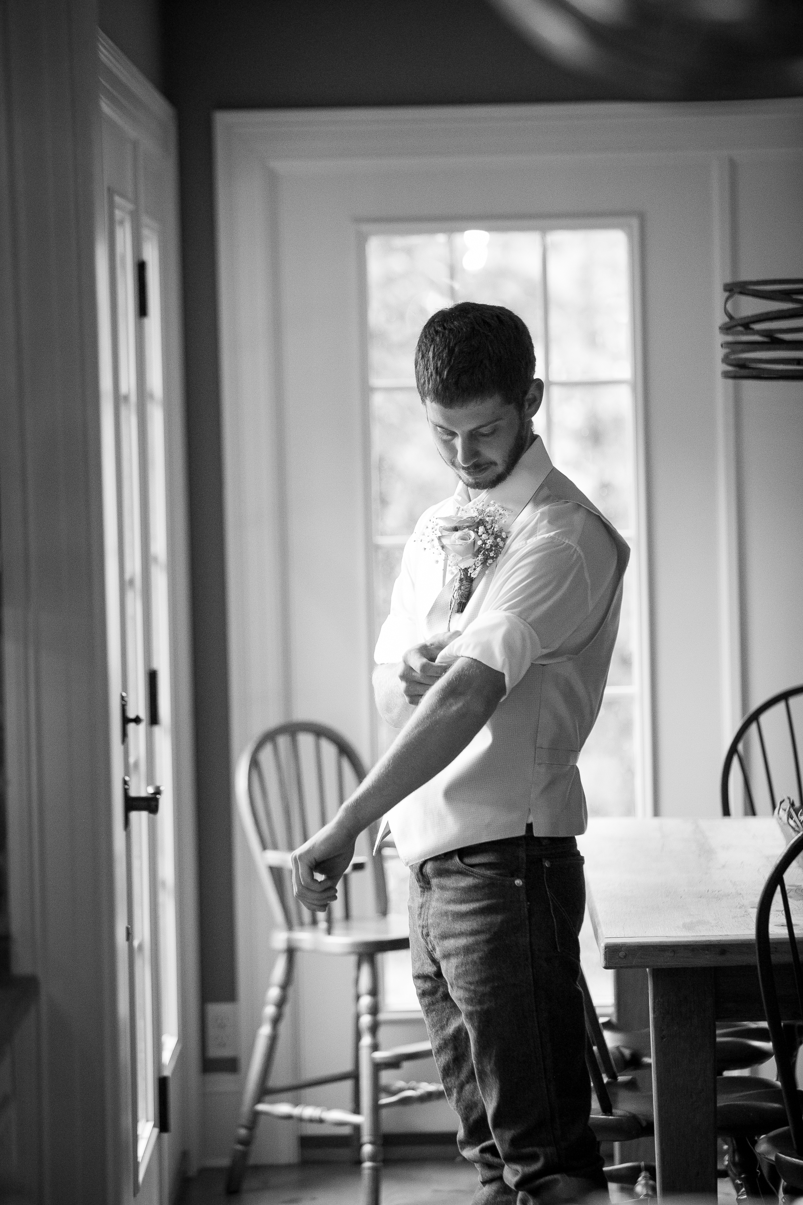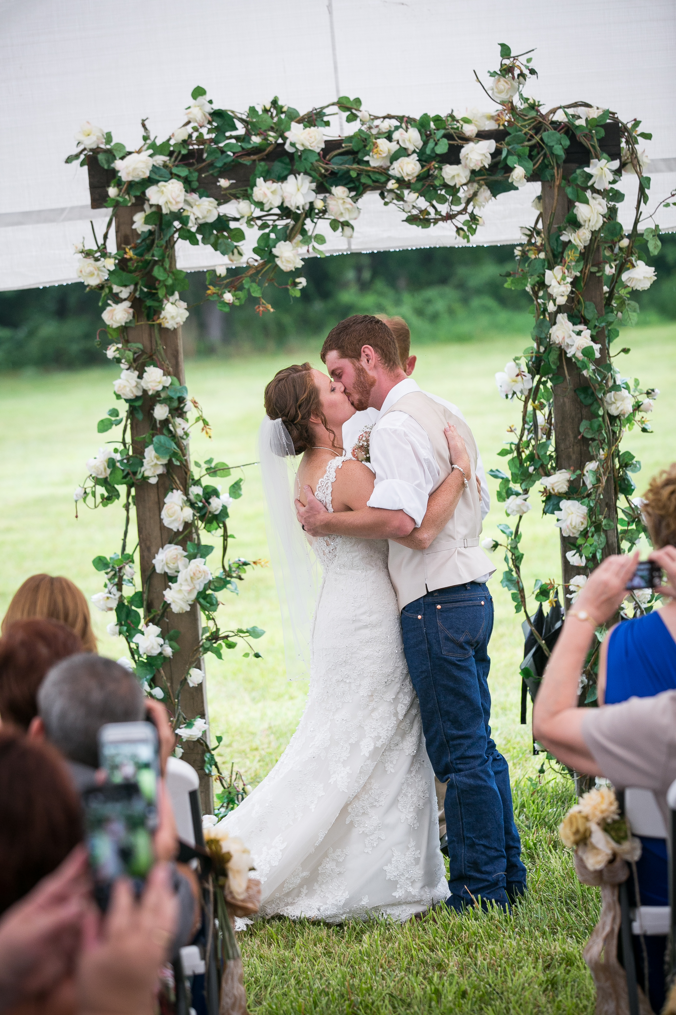 The morning started with the girls in a beautiful bridal house. Emiline looked stunning in her dress and we took full advantage of all the window light in the house. It rained off and on so when we had a break in the rain we were able to take advantage of the beautiful property and get some photos outside. The ceremony was planed to be in the pasture and about a half hour before things were to get started a heavy rain rolled in.  Even with the rain Chris and Emiline were not going to let that change their plans. They decided to move a large white tent over top of the ceremony site and kept everything to plan. After the ceremony there was a brief break in the rain so we explored the property a bit.