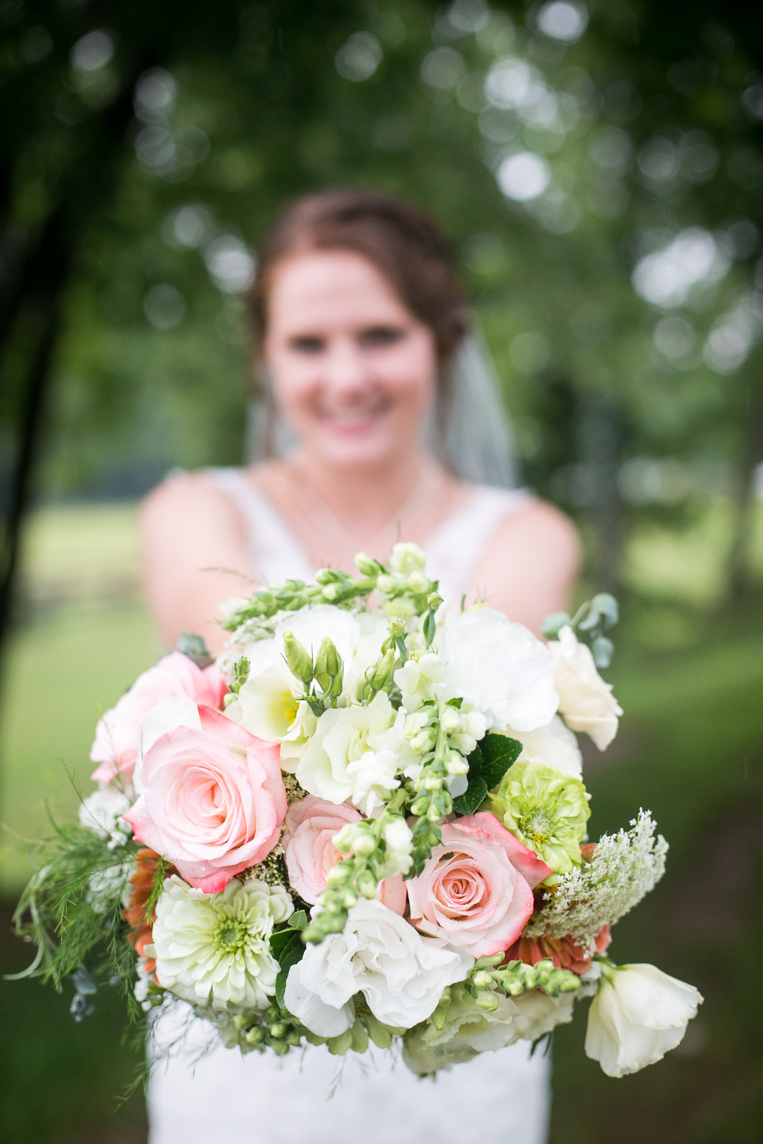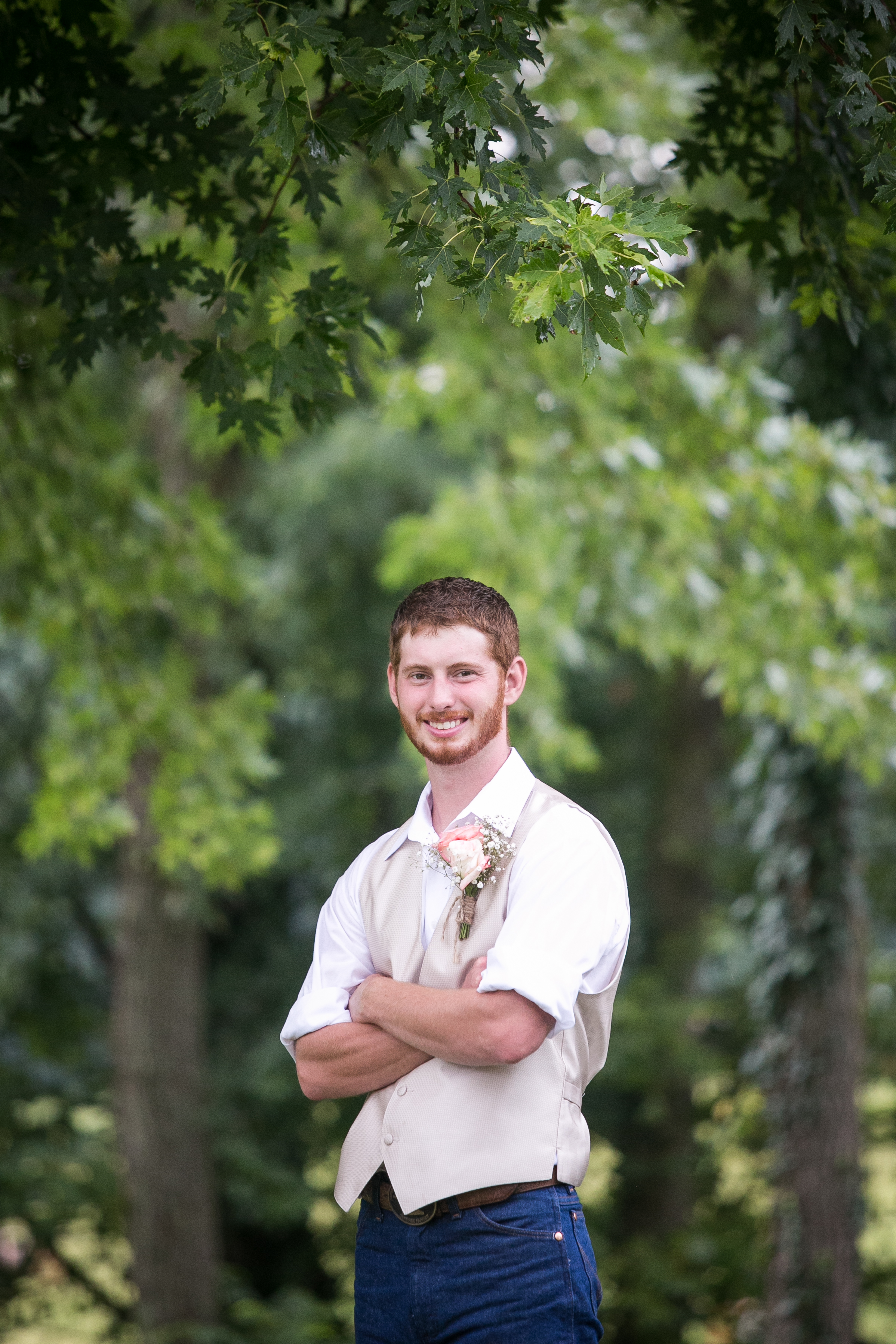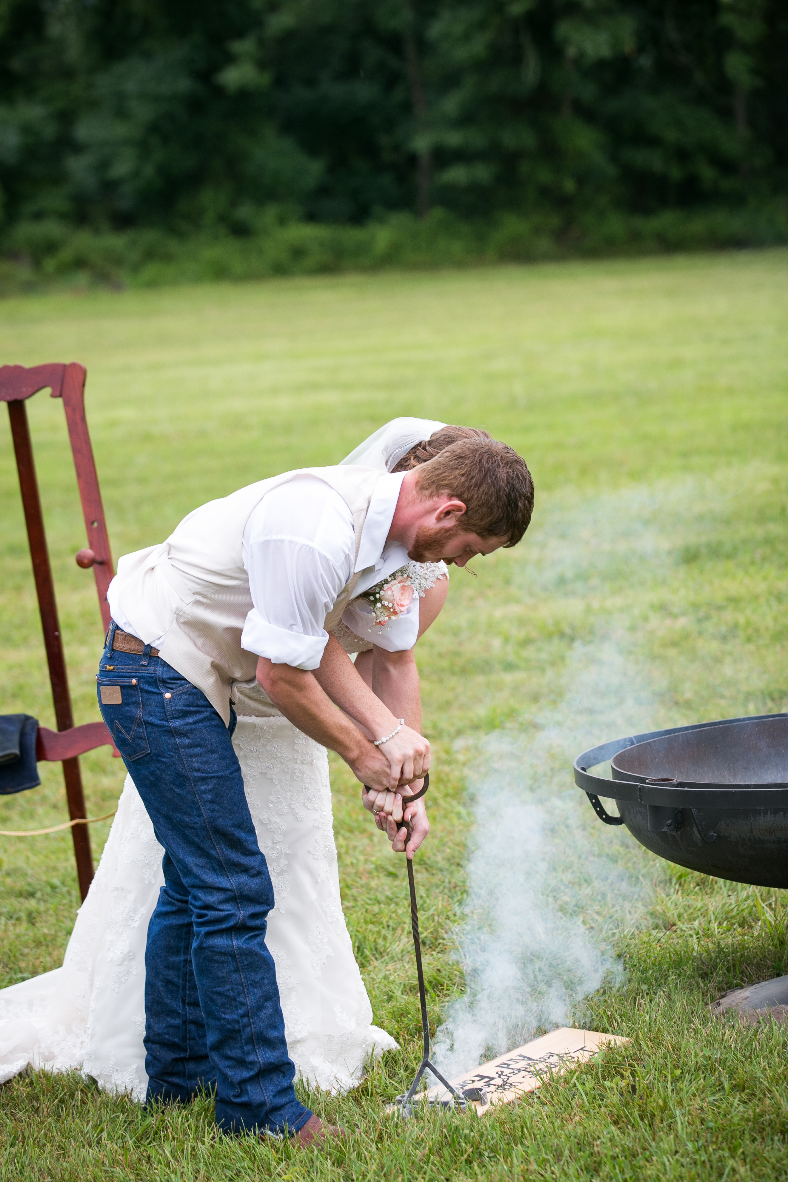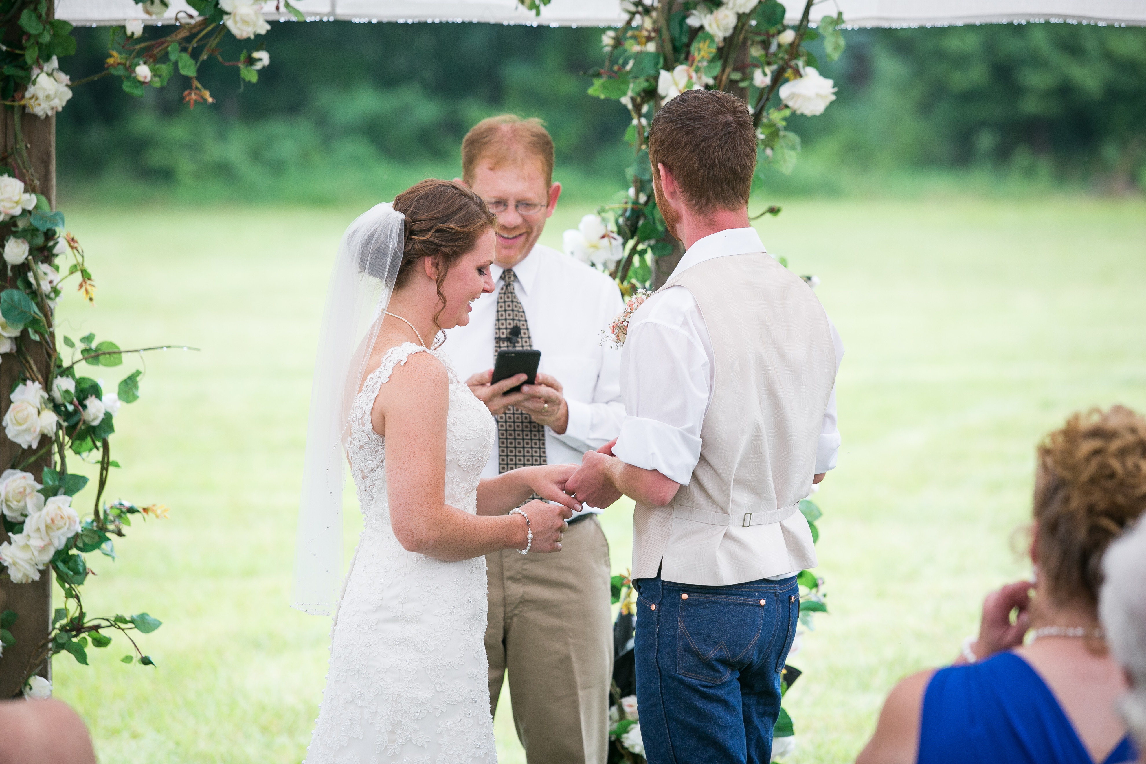 The morning started with the girls in a beautiful bridal house. Emiline looked stunning in her dress and we took full advantage of all the window light in the house. It rained off and on so when we had a break in the rain we were able to take advantage of the beautiful property and get some photos outside. The ceremony was planed to be in the pasture and about a half hour before things were to get started a heavy rain rolled in.  Even with the rain Chris and Emiline were not going to let that change their plans. They decided to move a large white tent over top of the ceremony site and kept everything to plan. After the ceremony there was a brief break in the rain so we explored the property a bit.